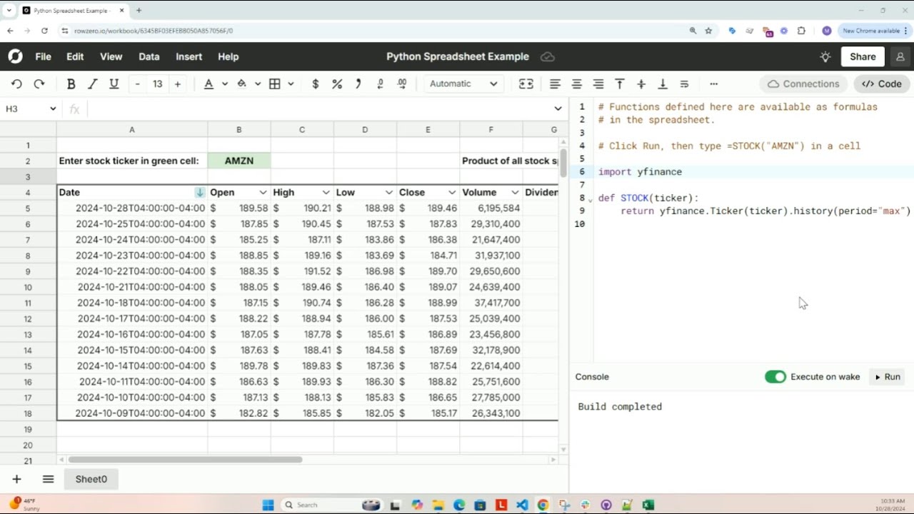 Row Zero spreadsheets have a native python window for writing custom functions and importing python packages like numpy, scipy, and pandas.