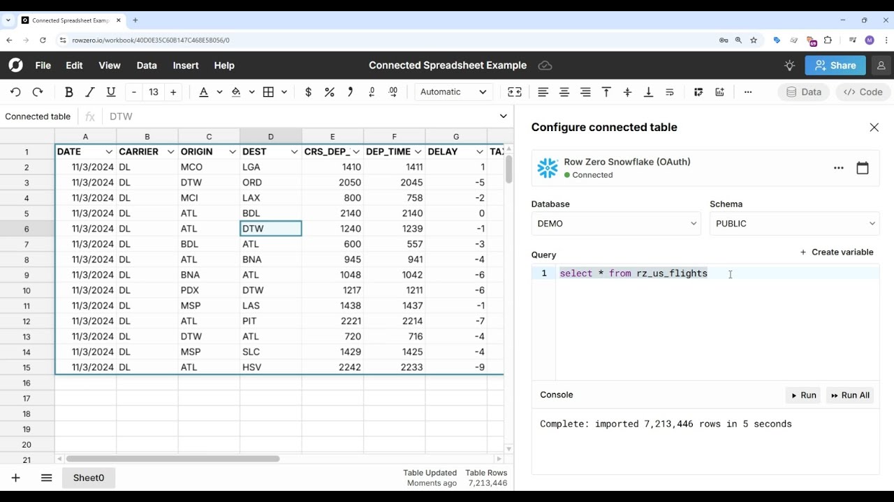 Row Zero has built-in data connectors to streamline data import, automate data updates, and enable dynamic dashboards, reports, analysis, etc. Built-in connectors include Snowflake, Databricks, Redshift, BigQuery, Postgres, and Amazon S3.