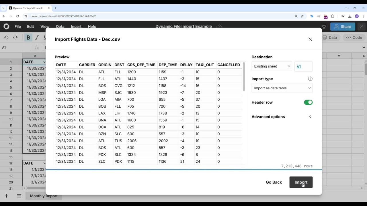 Row Zero makes it easy to open large files in a spreadsheet. You can open and edit big CSV files, parquet, JSONL, .txt, .gz files, XLSX, etc. You can also dynamically update your spreadsheet with a new file with a simple import to a specific cell.