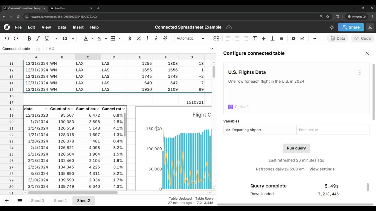 Row Zero makes it easy to build big, connected spreadsheets that auto-update. You can use the built-in data connectors to connect directly to your data source, write a query, and import data to a connected table. You can also share connected spreadsheets and data sources with teammates to give easy access to live, updating data without them needing to write SQL. Everything built on connected tables automatically updates when source data is refreshed, including pivot tables, charts, calculations, etc.