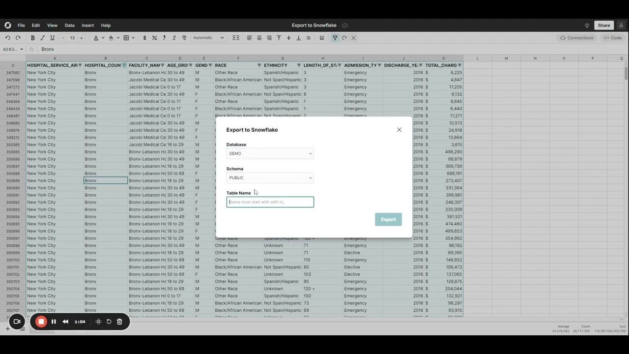 - The export to Snowflake modal will pop and ask you to select the database, schema, and specify a table name. New table names are forced to start with 'rz_' to avoid overwriting any tables already in the Snowflake cloud data warehouse. Hit export and Row Zero will create the new table in Snowflake and import all the data. When the export is complete, you will see a notification in the upper right-hand corner.