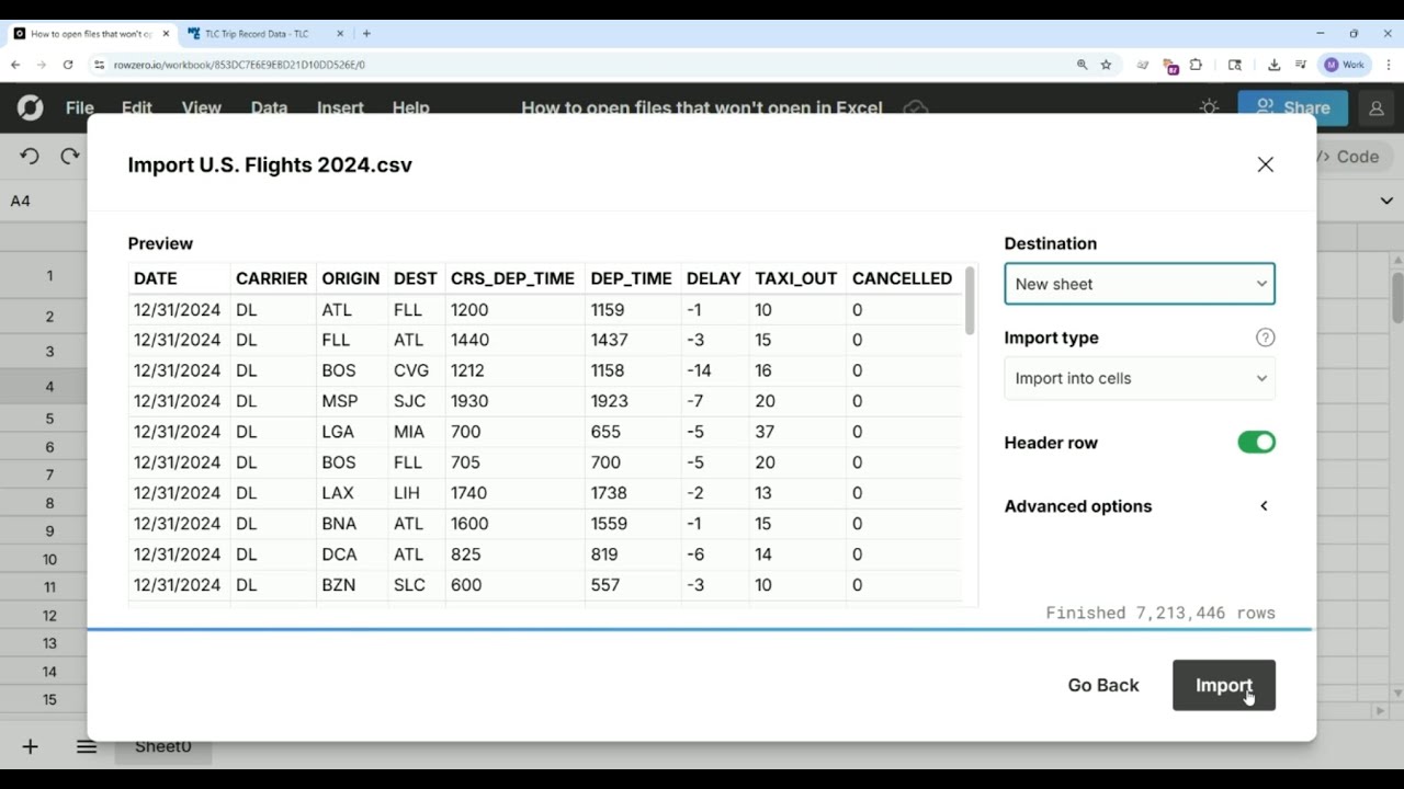 Solution: Open the file in Row Zero. Row Zero easily opens files too large for Excel. Row Zero is a spreadsheet for big data that works like Excel and Google Sheets but supports 1000x bigger datasets. Here's a breakdown of row limits by spreadsheet: