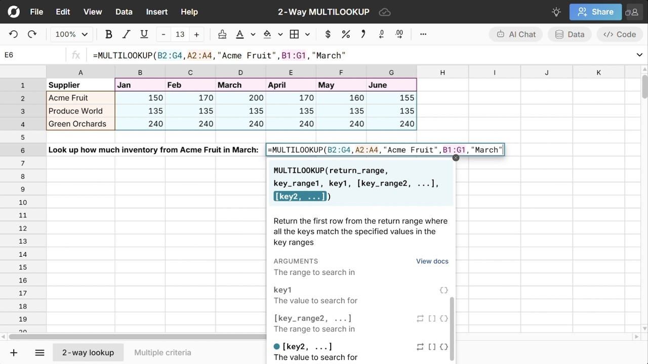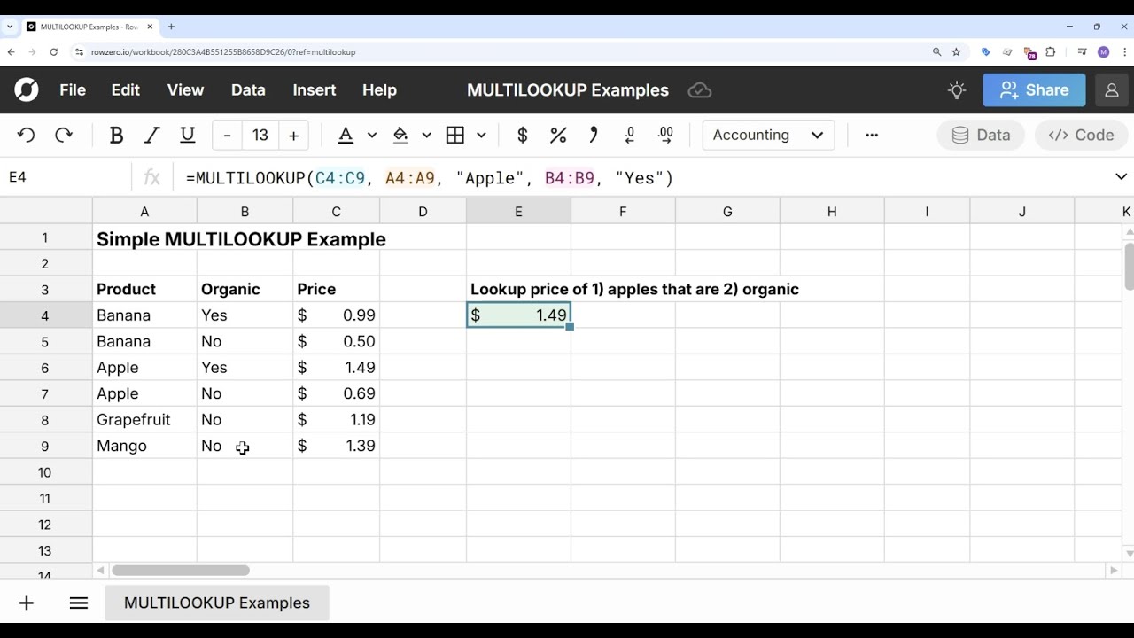 The MULTILOOKUP function makes it easy to look up values based on multiple criteria in a spreadsheet. MULTILOOKUP works like XLOOKUP and VLOOKUP but allows for multiple conditions. MULTILOOKUP is a unique function to Row Zero, a next-gen spreadsheet designed to work with large datasets and complex calculations. Continue reading to learn how to use MULTILOOKUP, as well as XLOOKUP with multiple criteria.