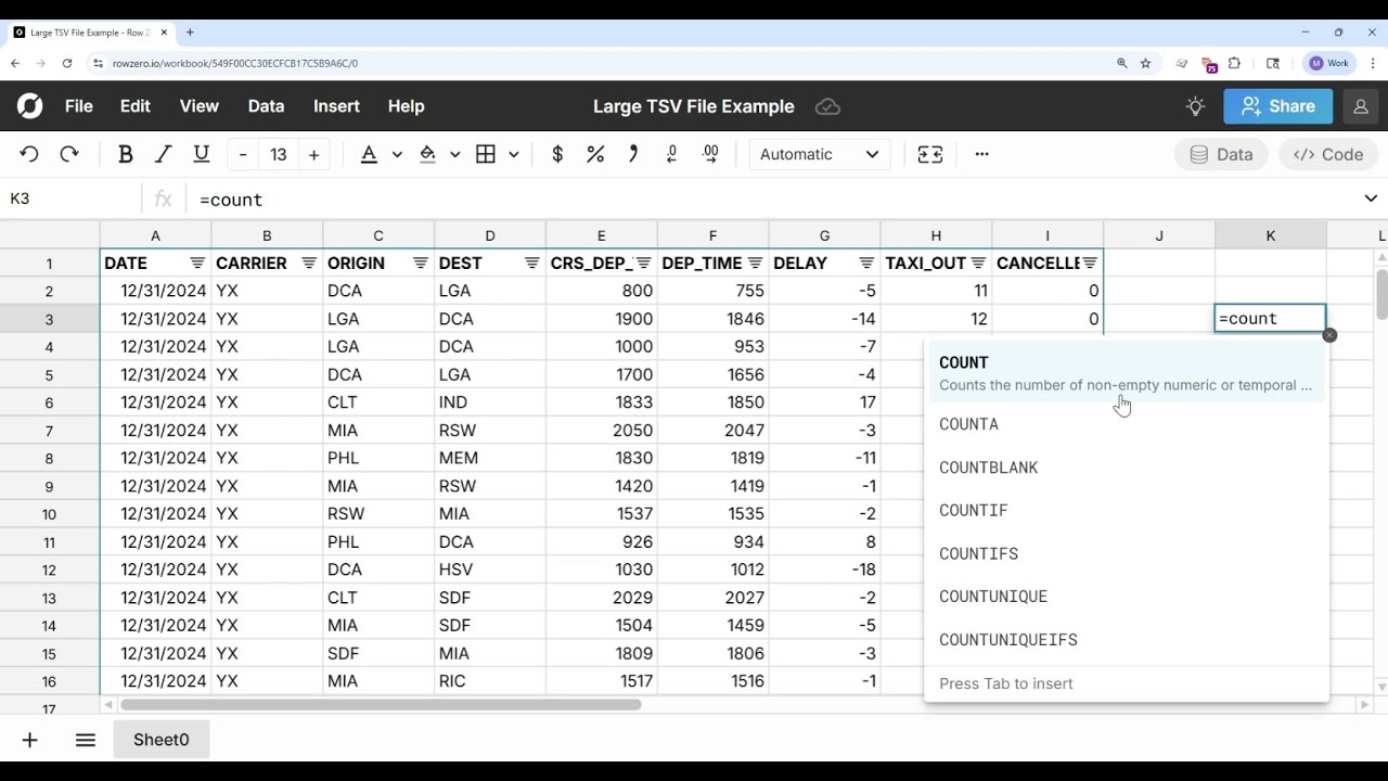 As you can see, Row Zero is the only spreadsheet application that opens very large TSV files. Row Zero easily opens TSV files more than 1 million rows and is your best choice to open a big TSV file online without writing code.