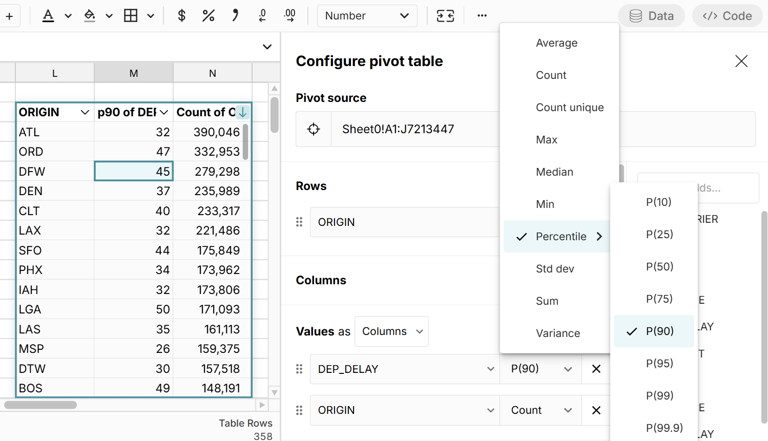 Pivot tables are an easy way to summarize data and either find or ignore outliers. Row Zero pivot tables support the typical value calculations like Max, Min, Median, Standard Deviation, etc. as well as some new calculations like Count Unique and Percentiles that can be useful for summarizing dirty data or accounting for outliers.
