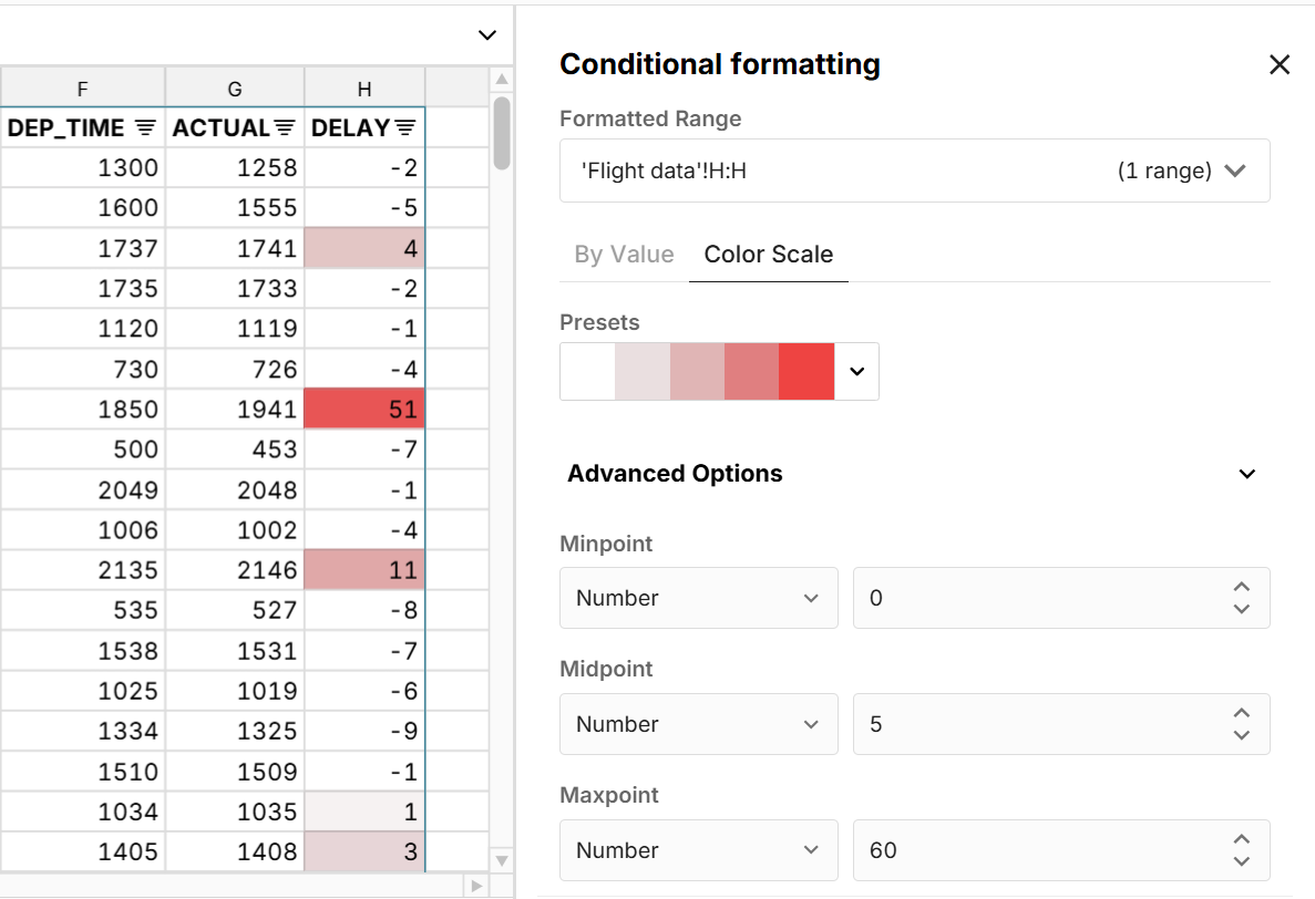 By Color Scale: Click on a color scale to automatically apply the color scale to the selection. Conditional formatting by color scale automatically formats the scale based on the min and max of the specified range. Click Advanced Options to customize the min, mid, and maxpoint to adjust the scale.