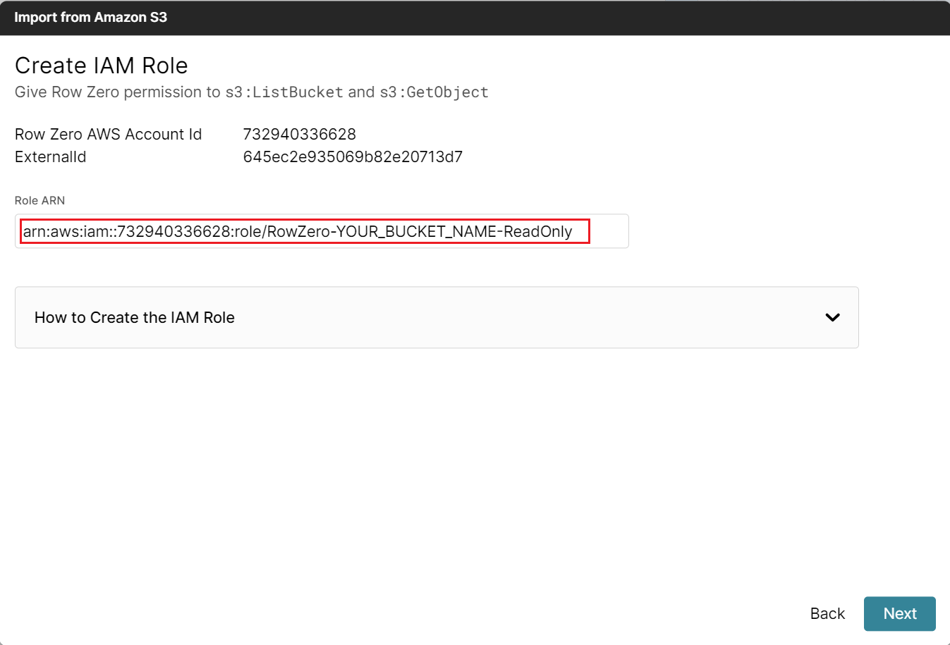Provide the Amazon Resource Name (ARN). To identify the name, follow the instructions below to create an IAM role for Row Zero and grab the ARN from the AWS console. At the top of the screen your Row Zero AWS Account ID and your External ID will be visible. Both will be needed to create the IAM role.