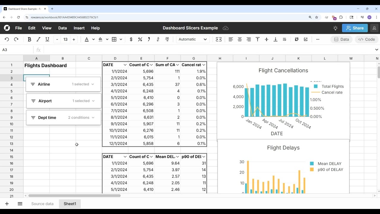 A slicer is an interactive filter that can be moved anywhere in the workbook and makes it easy to quickly filter multiple pivot tables and charts at once. Slicers filter the underlying source data, which dynamically filters everything that references the source data. You can place the slicer next to your charts and pivot tables to make it easy to filter underlying data on another sheet. The documentation below shows how to create and work with slicers in Row Zero.