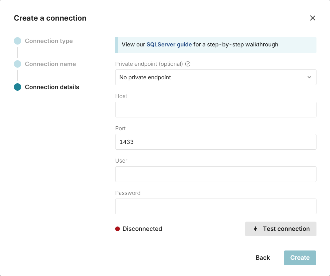 - Once all the information is entered, hit 'Test connection' to ensure the information is correct. If the test connection icon turns green and says 'Connected', proceed by clicking on 'Create Connection'.