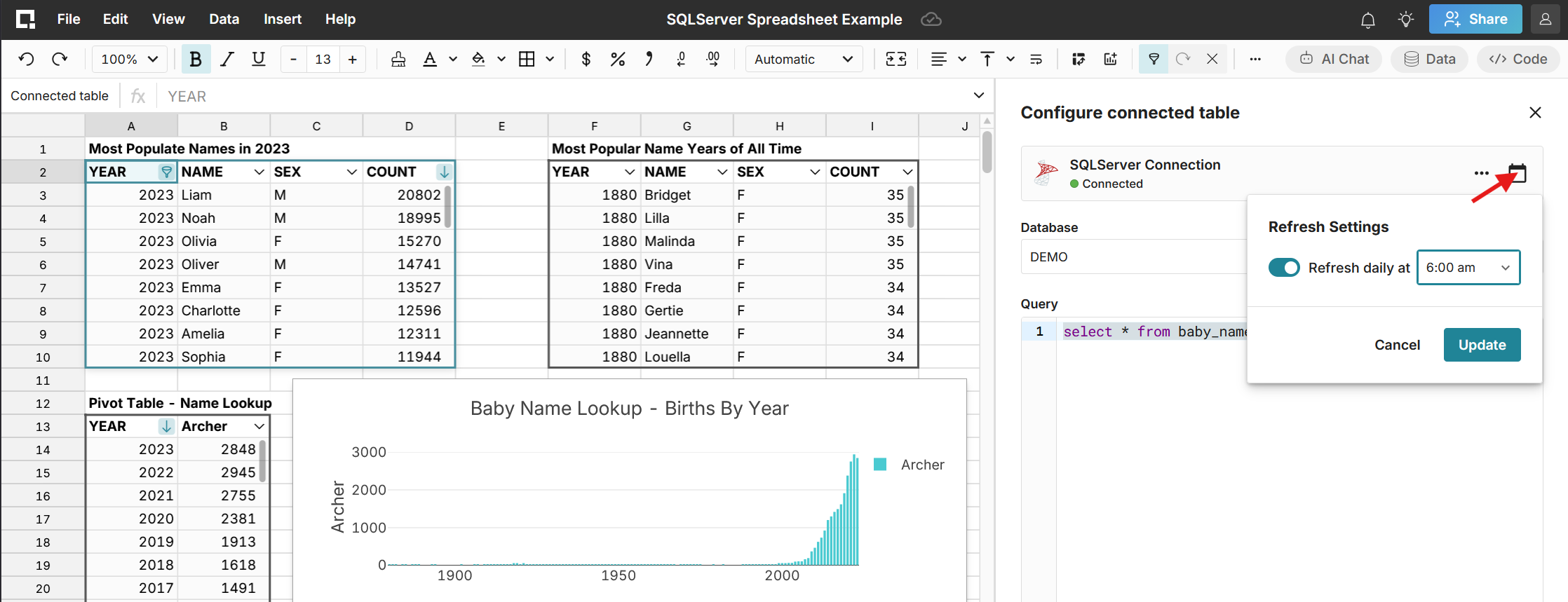 Double-click on the connected table to re-run your query for the latest data or schedule auto-refresh and everything built on connected data automatically updates and stays in sync.