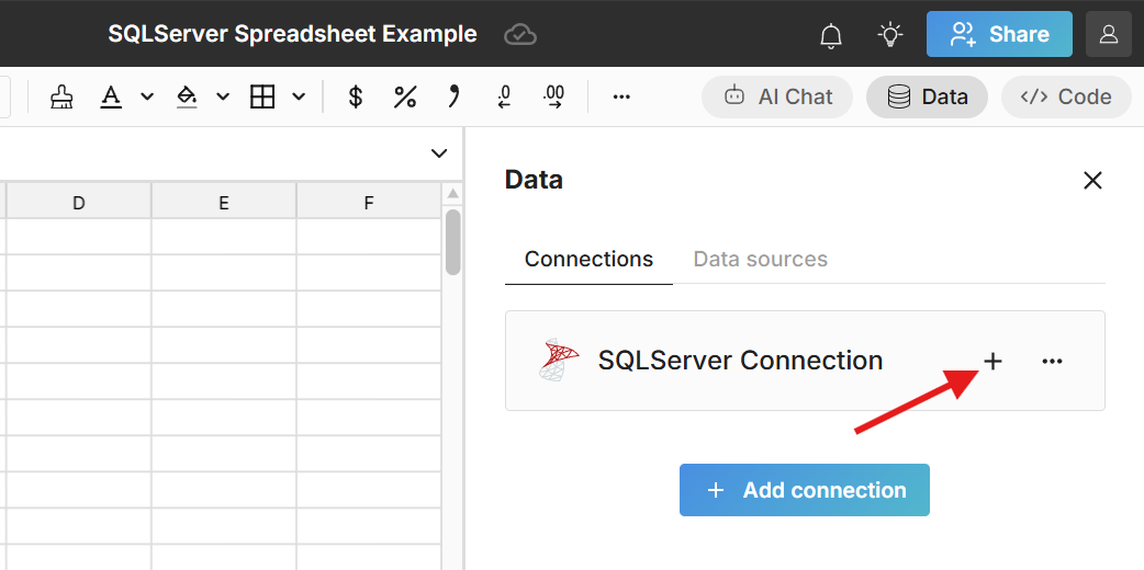 From any Workbook, click 'Data', and then click the '+' sign next to your SQLServer connection to insert a connected table. This adds a data table to your spreadsheet that is connected to SQLServer and opens a query editor.