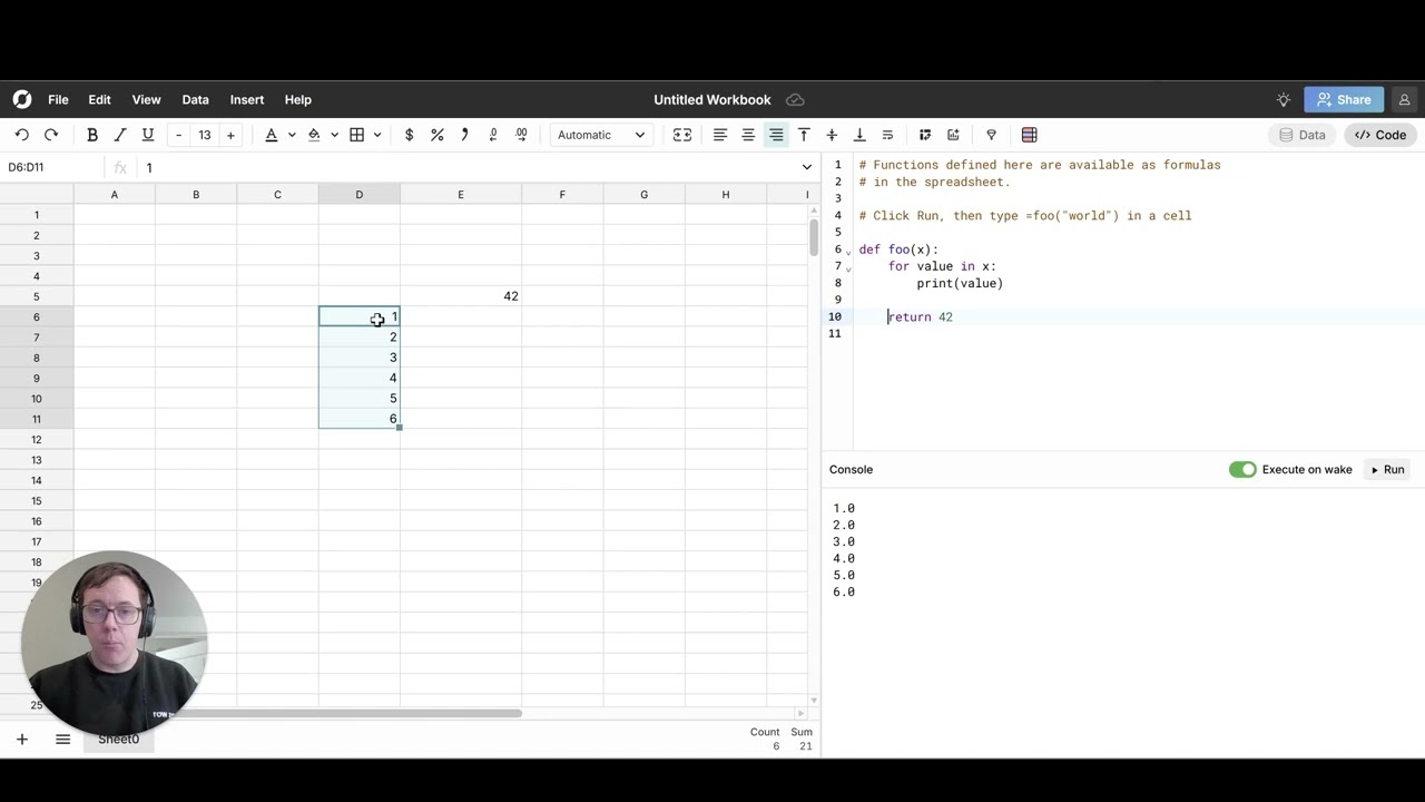 See how to use Python to manipulate spreadsheet data in Row Zero, including how both spreadsheet primitive types (text, numbers, dates) and data tables can be passed to and from Python.