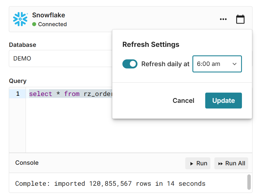 Seamlessly connect to your data warehouse and build connected spreadsheets that auto-update with the latest data. Everything built on connected data stays in sync including pivot tables, charts, and formulas.
