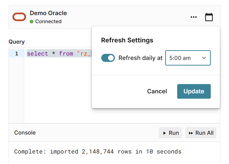 Row Zero is a secure cloud spreadsheet that connects to Oracle. Import millions of rows in seconds, analyze with spreadsheet features, and write-back to Oracle. Schedule auto-refresh to automate updates.