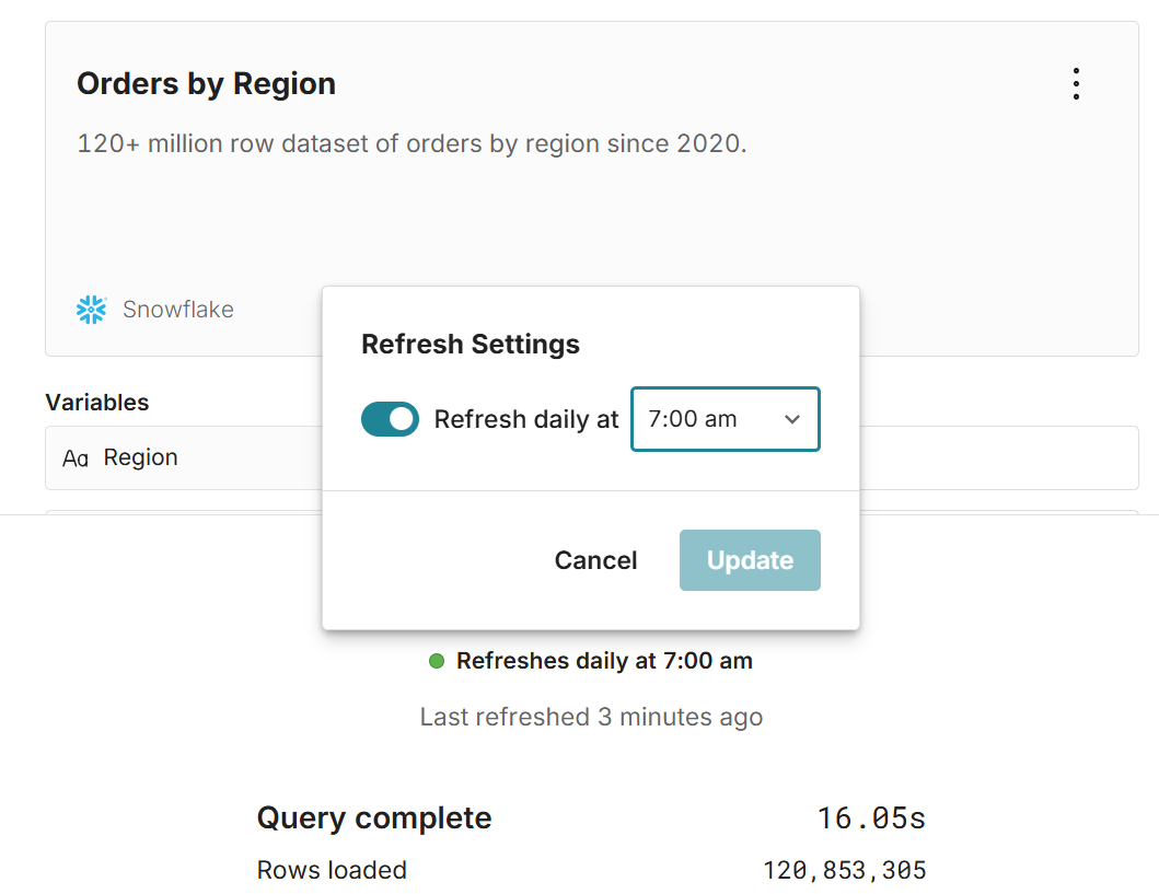 Build big connected spreadsheet that auto-update. All data and analysis, including charts, pivot tables, formulas, formatting, etc. automatically updates with new data. You can also write-back data to your data warehouse from the spreadsheet.
